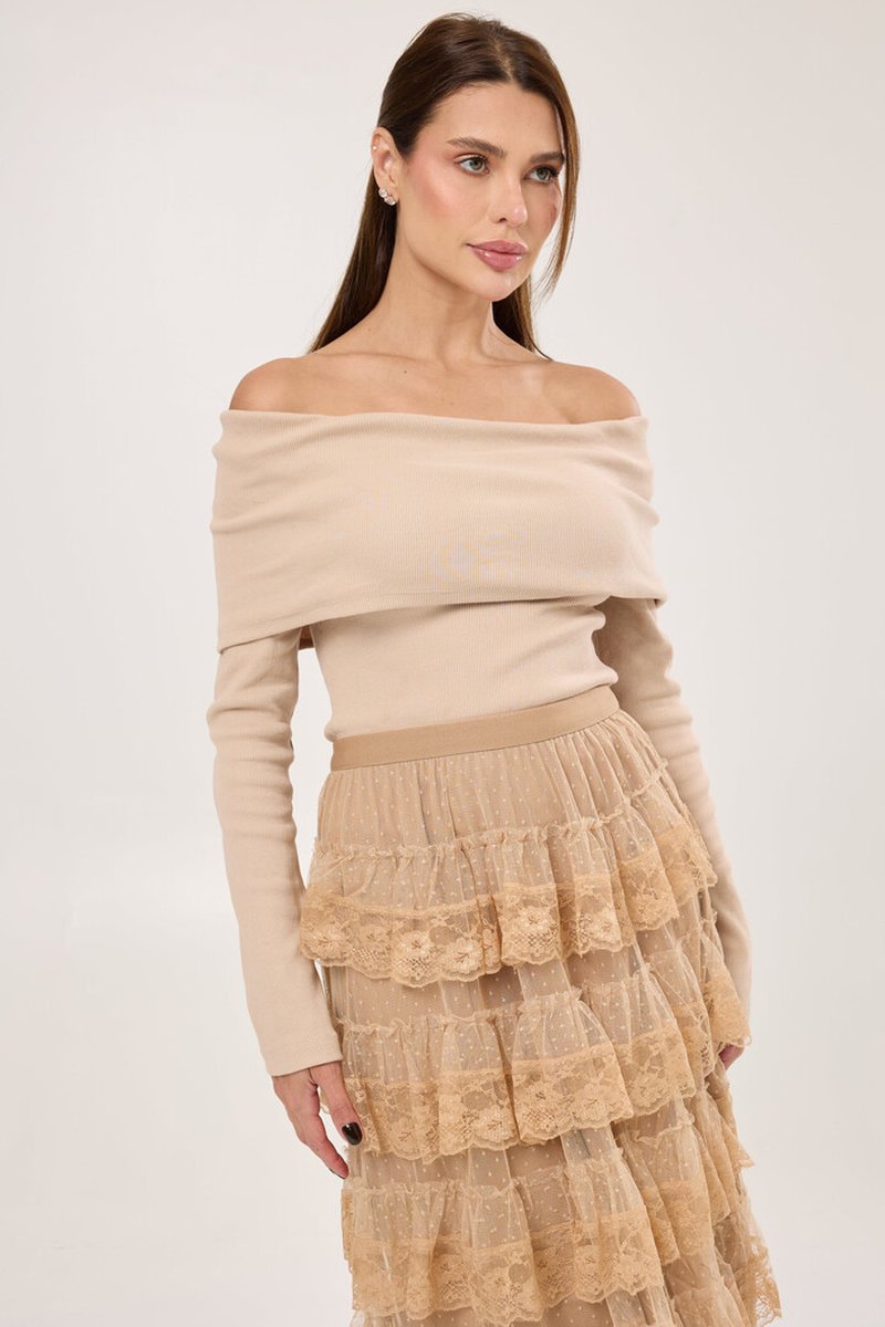 Esta encantadora blusa manga longa em ribana oferece um toque moderno e elegante ao seu guarda-roupa. Com um design ombro a ombro, ela realça os ombros de forma delicada e feminina, enquanto adiciona um toque de sensualidade ao visual.