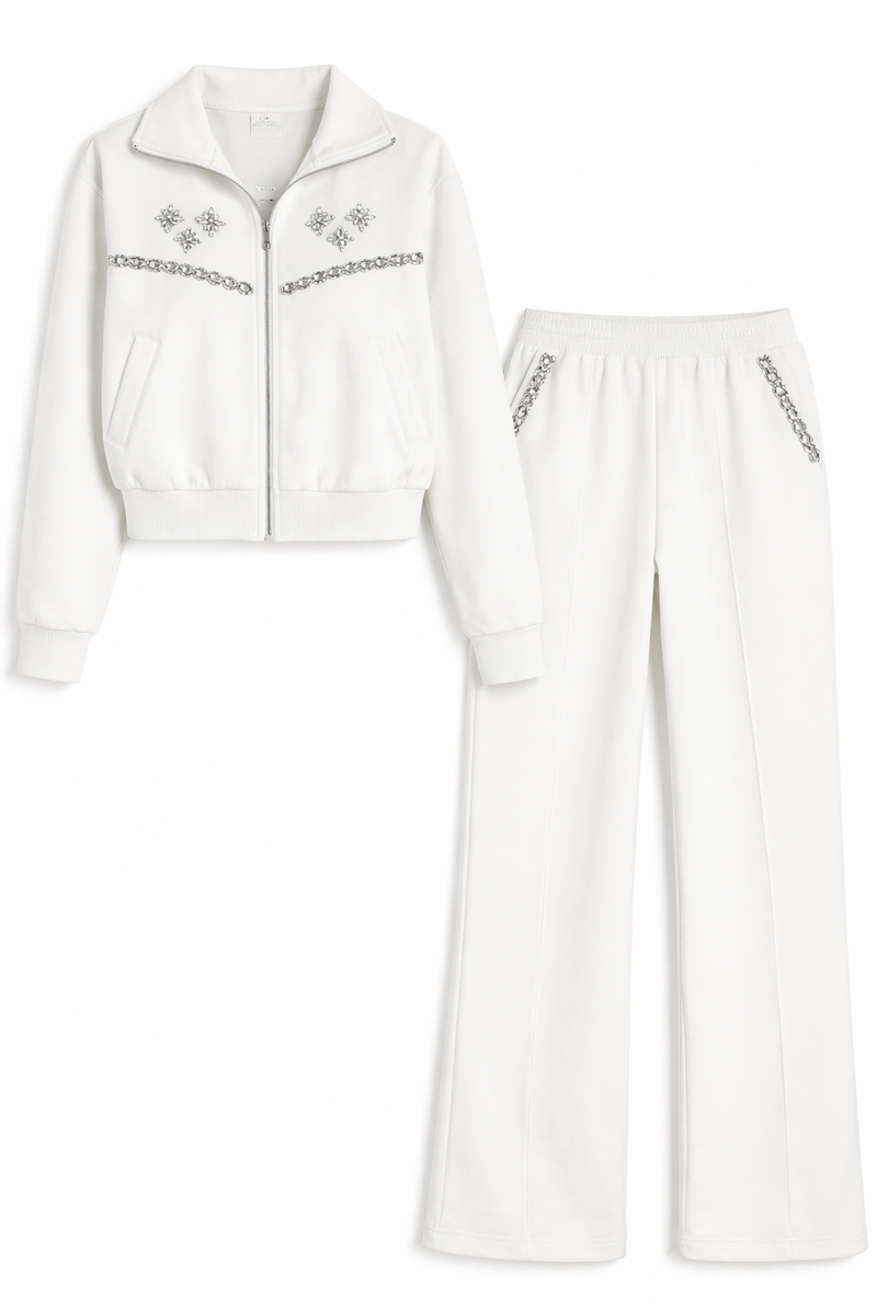O grande destaque está nas pedrarias, que aparecem em formatos florais e aplicações lineares, criando um visual moderno, delicado e harmonioso, com detalhes também presentes na calça. O brilho é sutil na medida certa, ideal para composições sofisticadas.