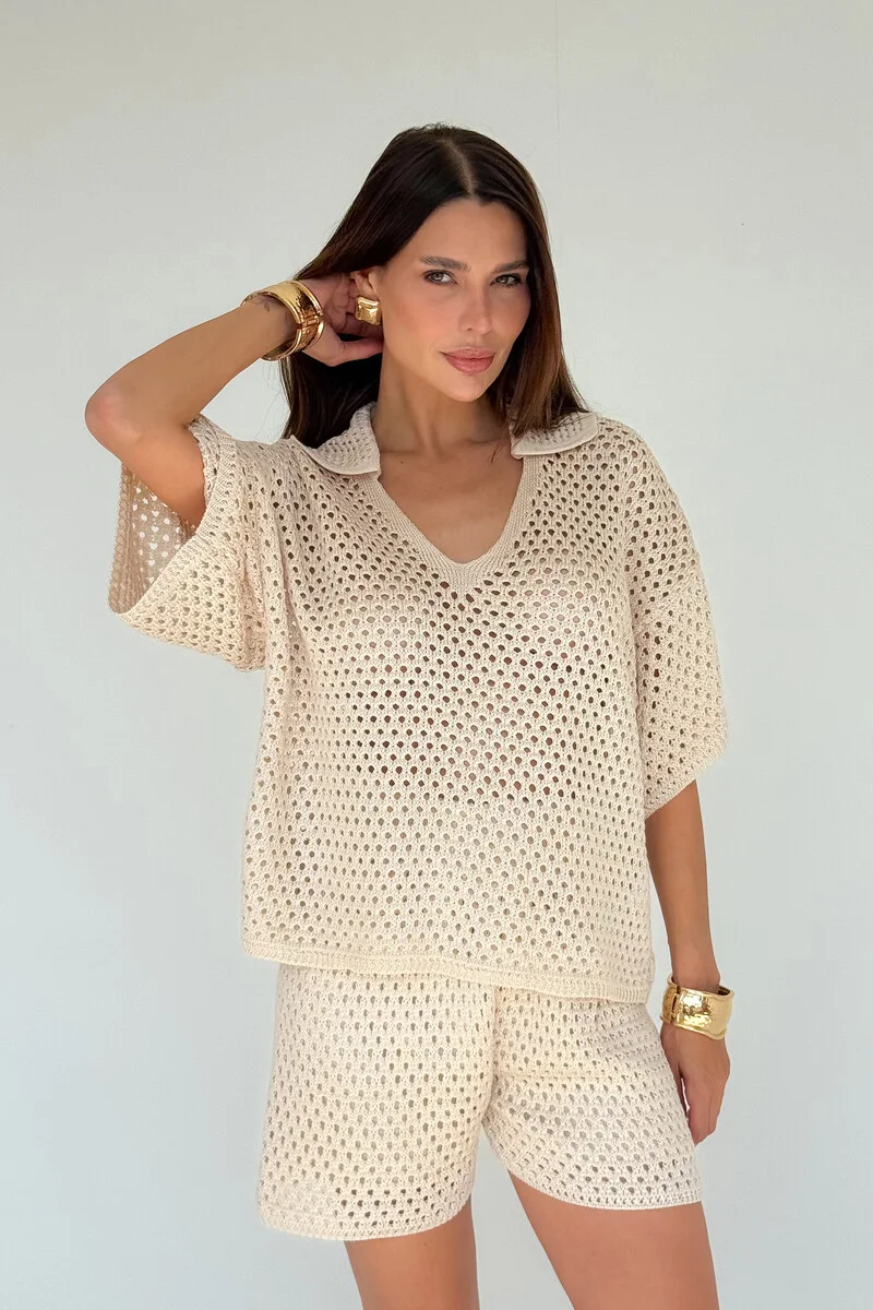 O short de cintura alta, com forro interno, garante ajuste confortável e segurança no vestir, definindo as curvas com suavidade e oferecendo movimentação livre. Um duo versátil que entrega presença com descontração — ideal para sunsets, viagens, passeios à beira-mar e ocasiões onde o dresscode pede estilo sem esforço.