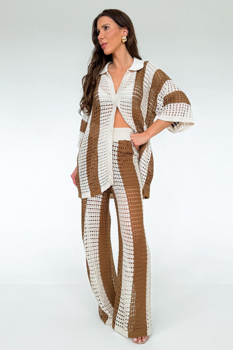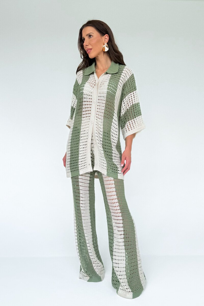Elegante e contemporâneo, o conjunto em tricô traz o equilíbrio perfeito entre conforto e estilo. A blusa tipo camisa alongada, com modelagem oversized, apresenta botões frontais que permitem diferentes formas de uso: aberta, sobreposta ou fechada. Criando um visual moderno e despretensiosamente sofisticado. O tricô de ponto mais aberto confere leveza e textura à peça, tornando-a ideal para produções cheias de personalidade.