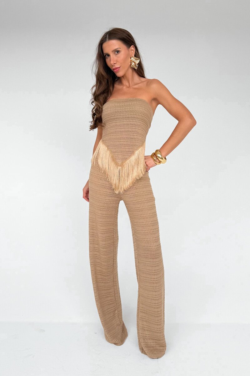 O Conjunto de Tricô com Franjas de Seda é a tradução do verão elegante com toque artesanal: marcante, fluido e naturalmente sofisticado. Suas franjas de seda aplicadas à mão criam movimento refinado, enquanto a calça pantalona de cintura alta alonga a silhueta com delicadeza. A blusa assimétrica, moderna e estruturada na medida certa, adiciona um charme singular que ilumina o look com personalidade.