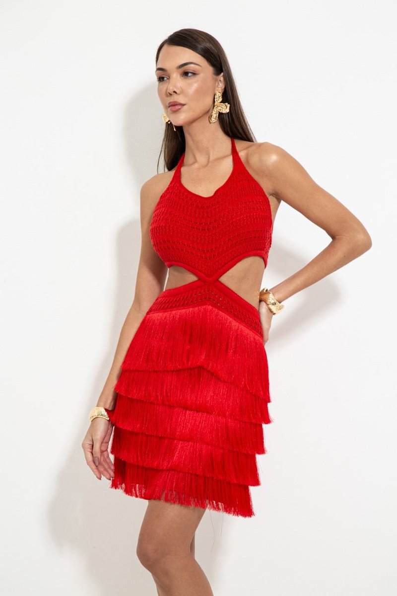 Vestido curto de tricô com um design ousado e refinado, ideal para mulheres que buscam um visual impactante e moderno. Allure, uma peça sedutora e irresistível, com um charme único, define perfeitamente este vestido. A saia, inteiramente aplicada com franjas, adiciona movimento e um toque vibrante ao look, destacando a personalidade da peça.