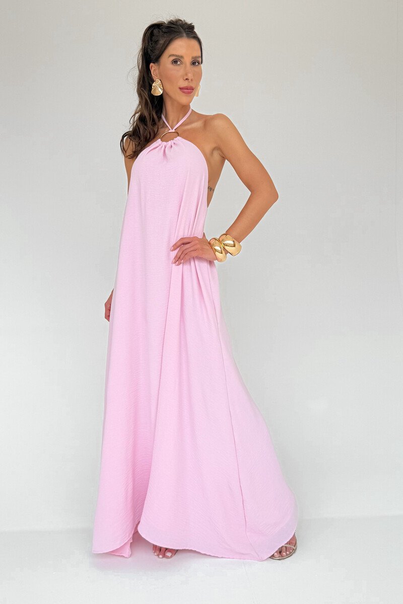 Com decote frente único e detalhe de argola que estrutura o busto com delicadeza, junto à silhueta e valoriza o colo, criando um visual moderno, feminino e atemporal. Seu caimento fluido e leve acompanha o movimento do corpo com frescor, confeccionado em tecido macio e confortável para um toque esvoaçante.