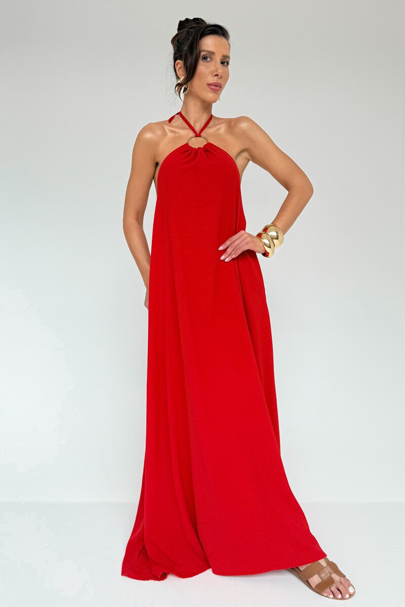 Com decote frente único e detalhe de argola que estrutura o busto com delicadeza, junto à silhueta e valoriza o colo, criando um visual moderno, feminino e atemporal. Seu caimento fluido e leve acompanha o movimento do corpo com frescor, confeccionado em tecido macio e confortável para um toque esvoaçante.
